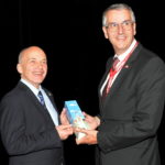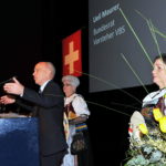 - Tagungsleiter Kantonsrat Jürg Messmer übergibt dem Bundesrat als Geschenk eine Flasche des geweihten Kirsches der Flugzeugtaufe des Swiss Airbus A-340 „Stadt Zug“ aus dem Jahr 2012