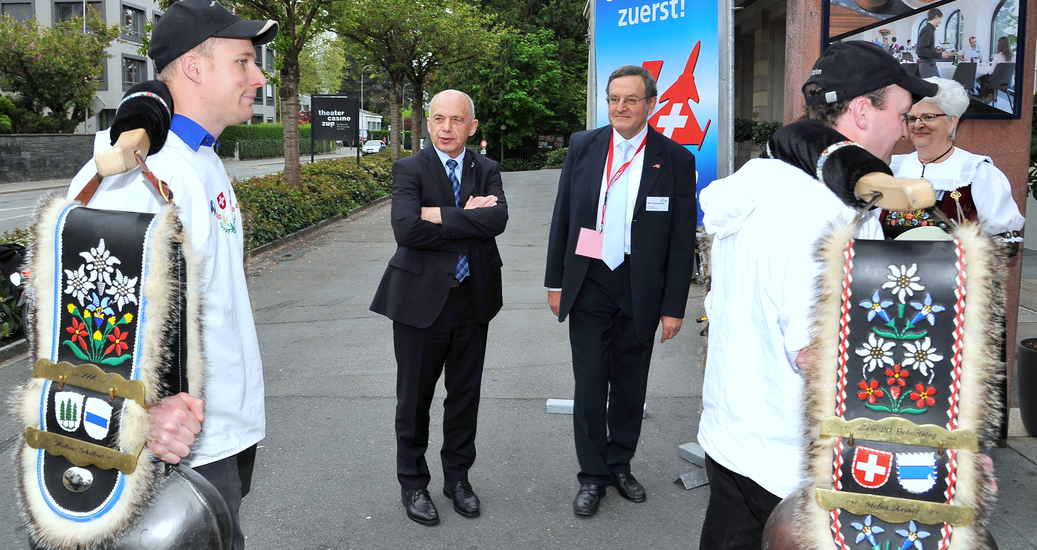 Die zahlreich eintreffenden Gäste wurden durch das junge Schwyzerörgeli-Duo Rohrer-Schillig aus Neuheim im Theatersaal musikalisch unterhalten. Der rechtzeitig eintreffende Bundesrat Ueli Maurer wurde durch die Trychlergruppe Menzingen musikalisch begrüsst. Zwei in Zuger Festtagstracht gekleidete Ehrendamen der Trachtengruppe der Stadt Zug nahmen am Empfang teil. Der Stadtrat von Zug war durch Herrn Stadtrat André Wicki vertreten und hiess den hohen Gast in der Stadt Zug offiziell herzlich willkommen.