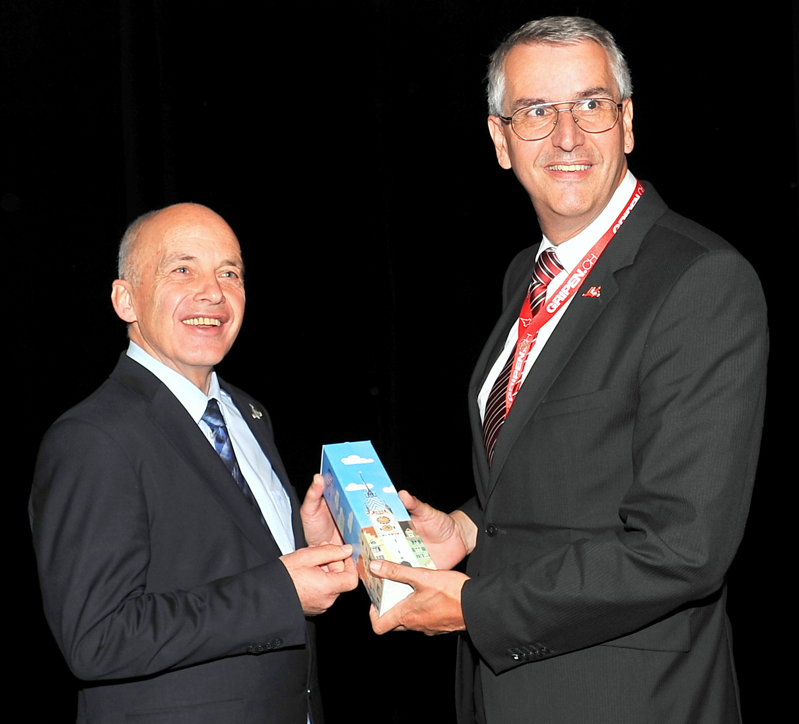 - Tagungsleiter Kantonsrat Jürg Messmer übergibt dem Bundesrat als Geschenk eine Flasche des geweihten Kirsches der Flugzeugtaufe des Swiss Airbus A-340 „Stadt Zug“ aus dem Jahr 2012